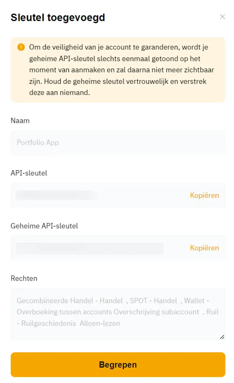 11. Bevestig met je wachtwoord en 2FA als daarom gevraagd wordt. Vervolgens wordt de API-sleutel en API-secret getoond.