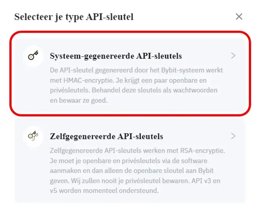 3. Kies in de pop-up "Selecteer je type API-sleutel" voor de optie "Systeem-gegenereerde API-sleutels".