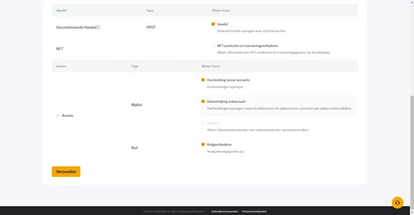 9. Zet de vinkjes aan bij "Handel", "Overboeking tussen accounts", "Overschrijving subaccount" en "Ruilgeschiedenis" zoals hieronder getoond.