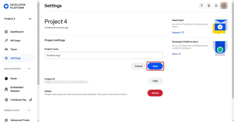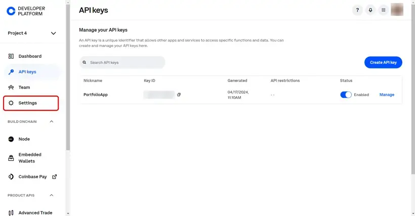 11. De zojuist aangemaakt API-key is zichtbaar in het overzicht API keys. Coinbase slaat API-sleutels op onder een project (standaard Project 1). Optioneel kun je het project een naam geven. Klik dan op "Settings" in het menu.