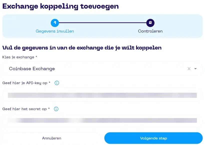 15. Kopieer de API-sleutel (sleutel naam) en API-secret (privé sleutel) van Coinbase in de wizard Exchange koppeling toevoegen in de Portfolio App.