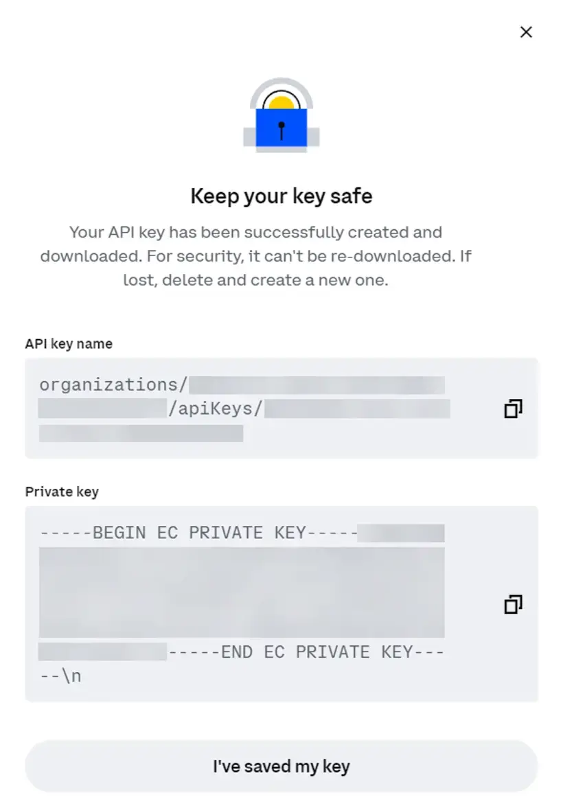 9. De API-naam en API-privé sleutel worden getoond. Sla deze beide tijdelijk op in het Kladblok programma of iets vergelijkbaars.