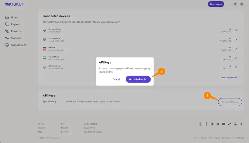 2. Scroll naar de onderkant van de pagina en klik op de knop (1) "Create API key" en vervolgens op (2) "Go to Kraken Pro".