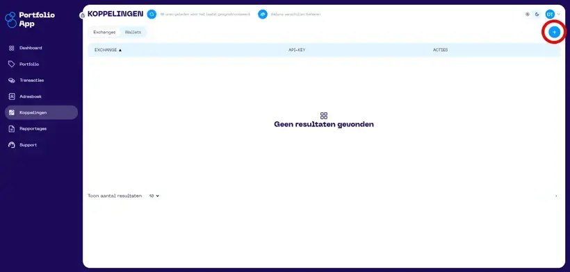 5. Open in een nieuwe browser sessie de Beheer je Crypto Portfolio App en ga naar Koppelingen en voeg een Exchange koppeling toe.