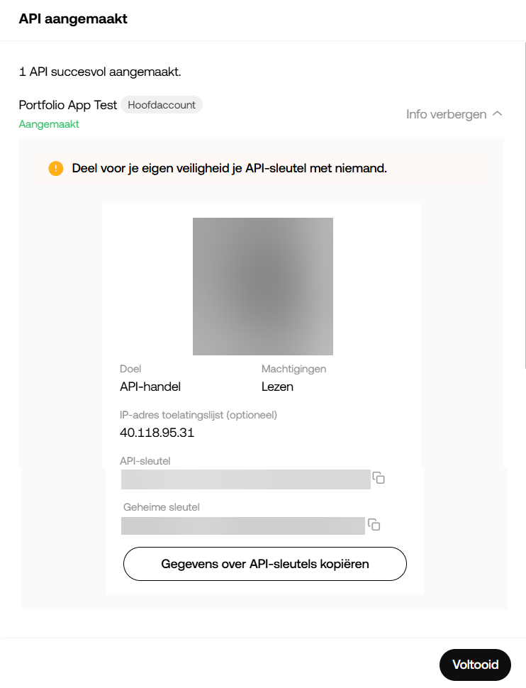 7. Ga terug naar je OKX scherm en klik op de 'Voltooid' knop. Je keert terug naar het API-Sleutel overzicht scherm.