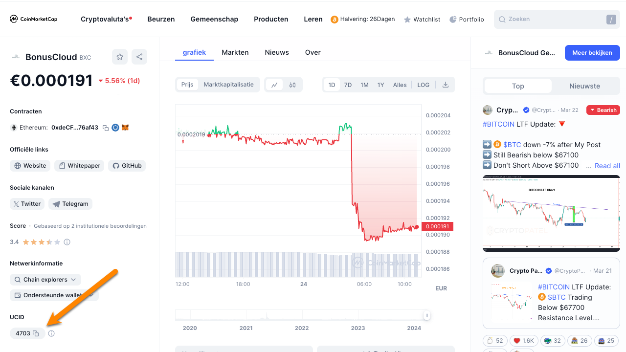 Als je een munt importeert waarbij het symbool niet uniek is, dan importeert de Portfolio App de munt met de hoogste ranking op CoinMarketCap. Indien dit niet de munt is die je wilt importeren dan kun je dit in het CSV-bestand oplossen. Je moet dan bij Symbool in plaats van het symbool van de munt het CoinMarketCap ID opgeven. Je kunt deze ID vinden op de CoinMarketCap website.